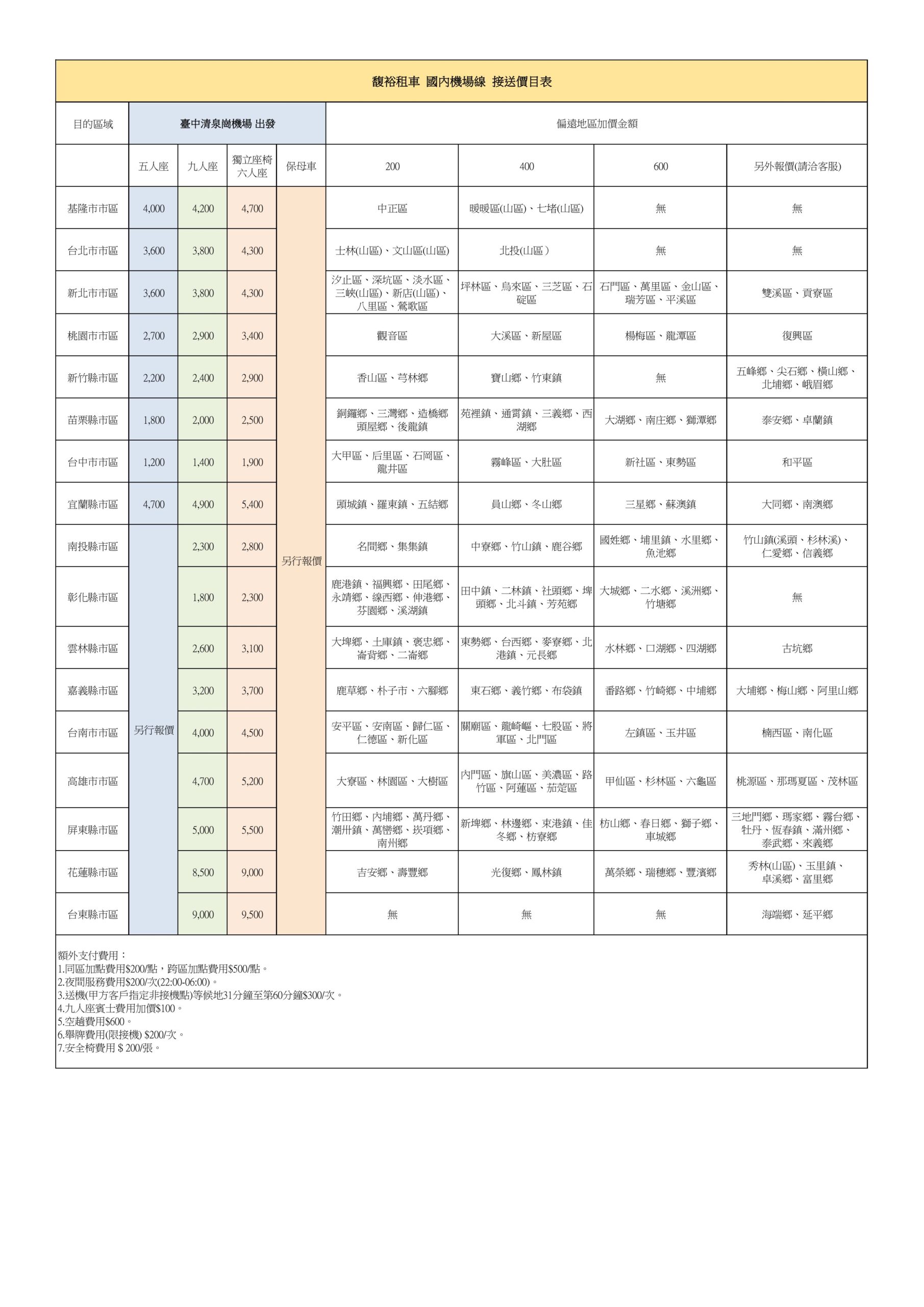 馥裕租車-臺中清泉崗機場 服務價目表